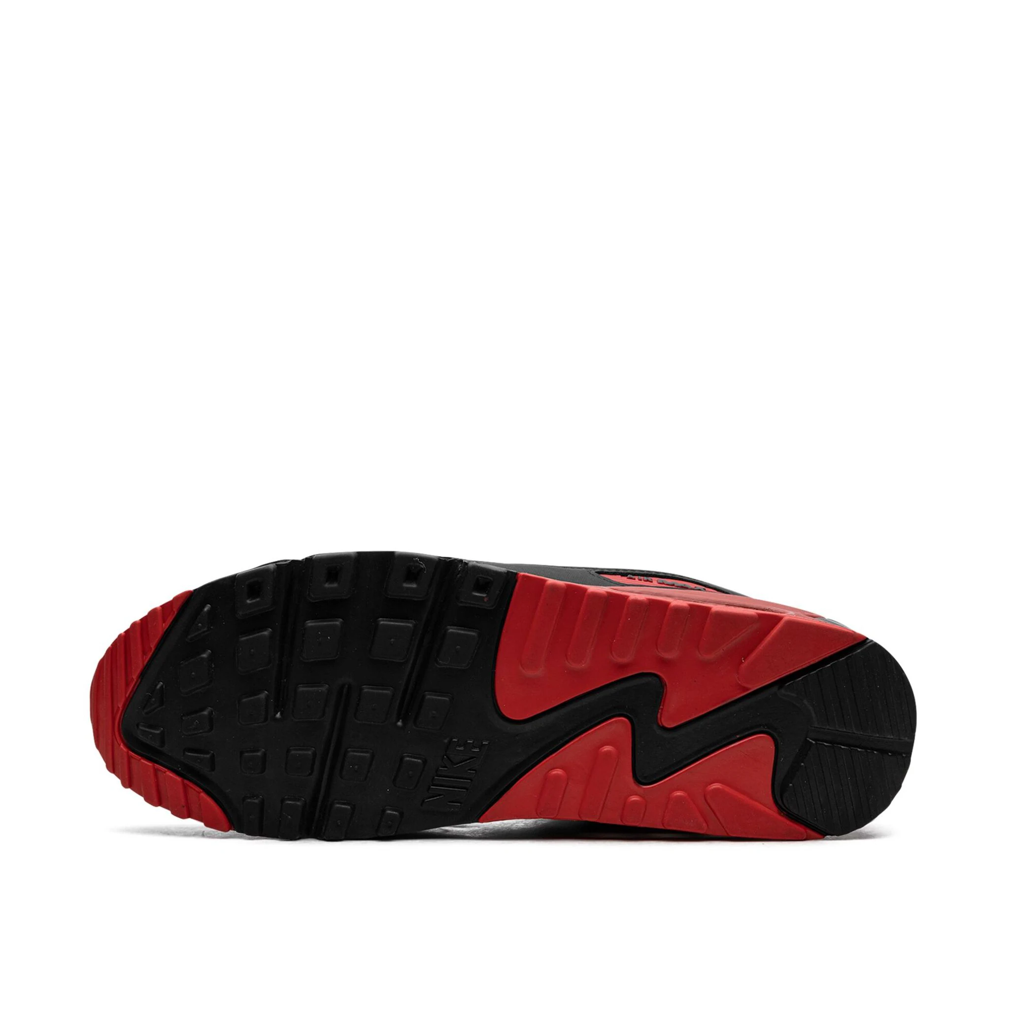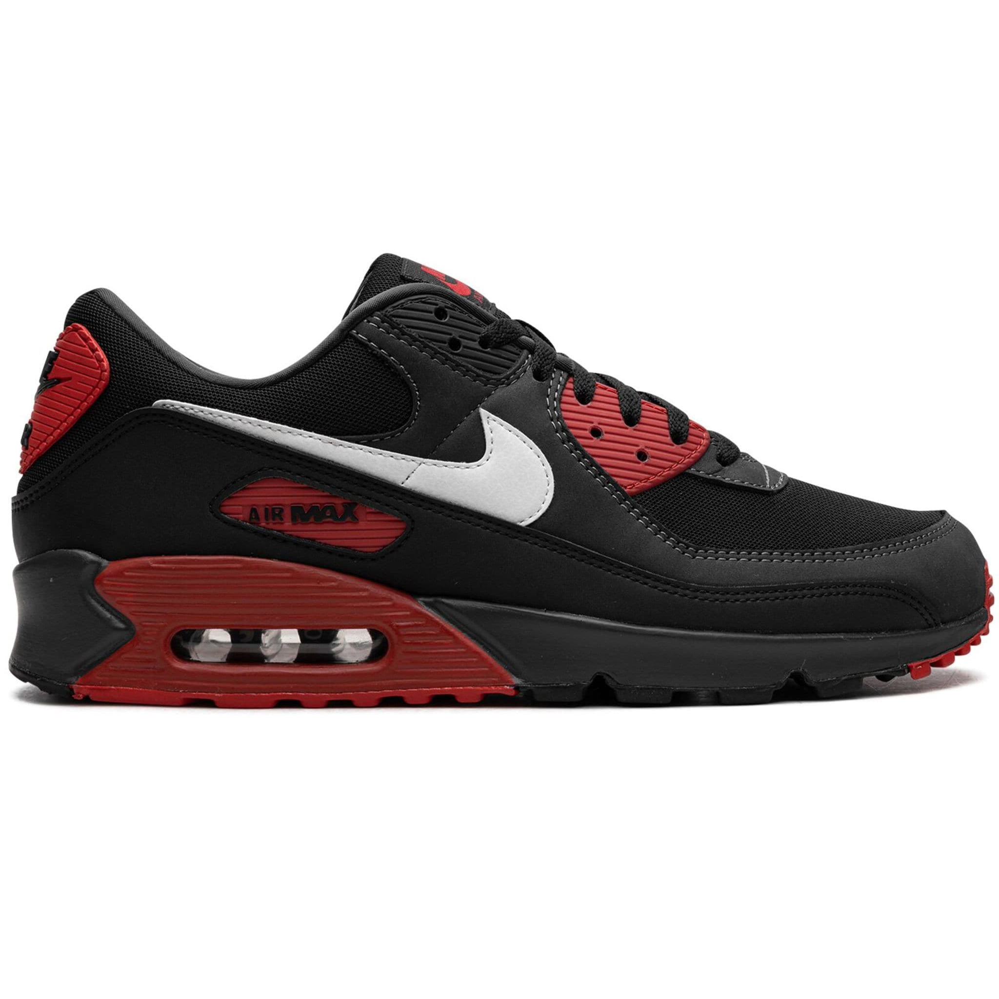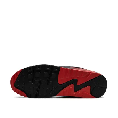 These Nike Air Max 90 sneakers feature a stunning combination of black and fiery red hues. The black textile base is complemented by a tonal nubuck mid-panel and mudguard, while a white leather Swoosh on both sides adds to the shoe's overall aesthetic. Furthermore, the midsole flaunts a red-coloured panel with a visible Air cushioning unit.